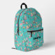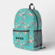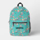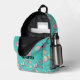 This backpack features a vibrant, all-over print in an artistic watercolor style. The light turquoise background is covered with a playful pattern of essential school supplies: a lamp, calculator, pencils, a ruler, and books in cheerful pink, yellow, and turquoise hues. The custom name "Samantha" is elegantly displayed on the front pocket, matching the black zippers for a cohesive and modern look.