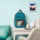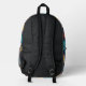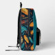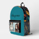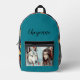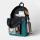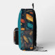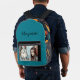 La sorprendente mochila india nativa americana tiene una mujer india y un lobo majestuoso en el bolsillo con cremallera delantero. El fondo del frente es un azul verde azulado oscuro y se personaliza con la plantilla fácil de usar que se proporciona. Los lados de la mochila tienen un diseño de plumas único en naranja, amarillo y azul.