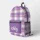 Púrpura y blanco personalizados Ligeros y duraderos, nuestra mochila todo-sobre-imprimir personalizado es justo lo que necesita. El espacioso interior es ideal para viajes, escuelas, gimnasios o cualquier necesidad de almacenamiento móvil. ¡Trae tus cosas con estilo! Características Correas de hombro acolchadas ajustables, dos cámaras en el interior para el almacenamiento de portátiles, bolsillos laterales de malla y una etiqueta de identificación.