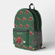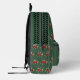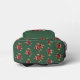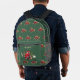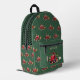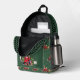 Back to school backpack, in forest green, with farm tractors design. Add the child's name to the front zippered pocket, in tan, printed font, above a single tractor image. The red tractor design includes some fun, farm animals and a dog, and is patterned over the front and sides. Tractor tire marks, in black, go across the zipper section at the top. A cute design for boys or girls.
