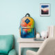La pintura azul, verde y naranja se combinan para hacer un hermoso y colorido diseño abstracto en esta mochila.