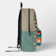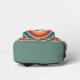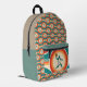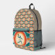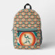 This backpack design is special for its nostalgic, sports-themed, retro aesthetic. It features a repeating pattern of vintage concentric circles in a muted palette of tan, teal, and orange. Each circle contains a silhouette of a basketball player. The large front pocket showcases an enlarged, bold player image, capturing a classic 70s/80s athletic vibe. This is a trendy accessory perfect for sports fans and vintage lovers.