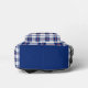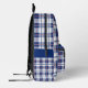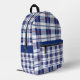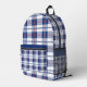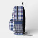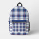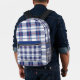 Es una mochila de moda, dorada, de color rojo, blanco y azul.