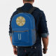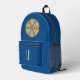 Una mandala de círculo concéntrico de color azul oscuro con puntos azules brillantes y con estrellas doradas esparcidos entre las capas y un brillante círculo de gradiente de ráfagas de sol detrás hace que el diseño sea divertido y que tenga en mente un cielo estrellado nocturno y un día soleado brillante con una imagen. Personalizar la primera vez en la bolsa delantera de esta mochila con su propio monograma para hacer este accesorio único suyo.