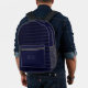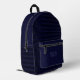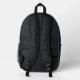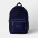 Esta mochila presenta un patrón de rayas negras y azules reales en la parte delantera y lateral, con una sólida zona de cremallera azul oscuro y un monograma triple desvanecido en el sólido bolsillo delantero azul oscuro.