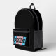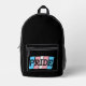 Backpack with text in the colors of the transgender pride flag. Pink, white, and blue flag of the trans pride movement, on a blue background