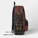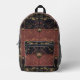 Old world European, exotic and dark, with a slight flavor of the Orient, the beautiful pattern by ZoeSPEAK, in natural colors on this Backpack, was made from Zoe’s original photograph of wrought iron latticework and tropical print fabric. Palm fronds and other tropical leaves, in shades of pale greens, terracotta and beige, rest gracefully on a black background behind the latticework. The design is in the style of a clutch bag or purse, with a floral medallion button closure on a dark background, smooth fabric flap over a faded burgundy textured fabric of the same pattern. The flap is edged with a salmon pink grosgrain ribbon.