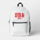 This cut and sew backpack is shown in a patriotic USA flag, and stars print.
