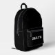 Mochila impresa personalizada personalizada de texto o monograma para deportes atléticos variados. Tipografía de texto de personalizable blanco varsity deportes atléticos sobre fondo negro de color sólido plano. Puede optar por borrar el texto y sólo tener una mochila de color sólido y negro. Esta mochila es genial para niños y adultos por igual.