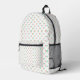 Two images of a backpack. Front: White with a colorful, geometric pattern, black zipper and pocket. Back: Solid black with adjustable straps. Casual and modern design.