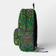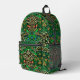 Mochila en un fondo negro con fondo de papel pintado floral de William Morris Jacobean de época, de tulipanes rosa de coral, margaritas amarillas, violetas azules, flores blancas delicadas y follaje verde jade