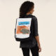 Una divertida y colorida pluma acuática y un dibujo en tinta de una tortuga marina en la playa (¡y no te pierdas el cachorro en el surf!) adornan la parte delantera de esta versátil mochila.