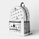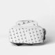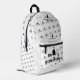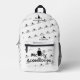 Mochila blanca con accesorios McFly negros en papel pequeño por todas partes. Gran impresión del logotipo negro de McFly Accessories en el bolsillo de la mochila.