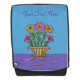 Esta mochila audaz para adultos Face con una cara frontal intercambiable tiene flores rosadas y naranjas bonitos sobre tallos largos con hojas en un lujoso jarrón azul y amarillo decorado sobre una mesa violeta con un fondo azul. Personalizar el texto con la plantilla.