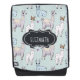 Mochila personalizada con un lindo patrón de llamas caprichosas. Uno está tumbado, uno tiene una flor en la boca, y uno te está mirando con recelo. Estos animales tienen mucho encanto. Se coloca sobre un fondo verde de puntos de polka. En la parte superior hay un marco elegante vintage en blanco y negro con tu texto en el interior.