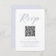 Esta moderna tarjeta de respuesta boda incluye un lugar para su código QR, de manera que los huéspedes puedan desplazarse fácilmente por su sitio web boda. La parte frontal presenta un diseño de caligrafía azul mutado simple y limpio con su código qr personalizado. La parte posterior mínima es de color pastel sólido azul en polvo.