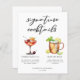 Esta hoja de menú de cócteles con la firma de la moda presenta una tipografía negra simple sobre 2 bebidas y sus ingredientes para su bar boda. Un bonito dibujo de Cherry French 75 y Moscow Mule añade un toque fresco a su menú del bar. Con los nombres de la pareja y la fecha de recepción.