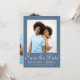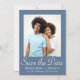 Esta boda de moda guardar la tarjeta de invitación de fecha contiene dos fotos y el blanco elegante guardar el guión de caligrafía de fecha en un polvoriento fondo azul. La parte de atrás es una foto completa. Infórmele a los invitados que los invitará a su próximo boda con esta simple foto minimalista, ahorrando la tarjeta de fecha (las invitaciones caseras coordinadas clásicas se pueden enviar en una fecha posterior, y están disponibles para ser compradas por separado).