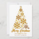 Una tarjeta de Navidades de una compañía de guiones de oro de moda con un hermoso árbol hecho de copos de nieve dorados sobre Feliz Navidad y Feliz Año Nuevo por encima de tu nombre de negocio. Personalice con un mensaje corporativo en la parte posterior para las tarjetas de vacaciones de copos de nieve de los clientes.
