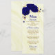 bellas flores azules reales y hojas de oro elegante menú de bodas.