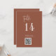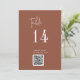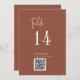 Este moderno número de tabla de códigos QR de terracota de moda es perfecto para un boda sencillo. El diseño del boho del desierto presenta una tipografía bohemia rústica única y elegante en un color de roya naranja quemado. La tarjeta se imprime en la parte delantera y trasera (doble cara). Utilice el código de barras para enlazar a su menú, o un sitio web o medio social donde sus invitados pueden compartir fotos. Agregue cada número de tabla que necesite a su carrito individualmente.