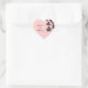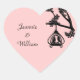 Bonito pegatina en forma de corazón, de color rosa, con una silueta negra de pájaros amorosos en una jaula colgada de una rama florida. El texto del guión negro tiene los nombres de la novia y el novio, y está listo para personalizar con sus nombres. Excelente como sellos para sobres como un toque final a nuestras invitaciones de boda de Aves de Amor Negro y Rosa de Moda.