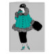 El ilustracion de la moda del vintage de una mujer en una falda negra apretada que alcanza debajo de sus rodillas, de un manguito negro y del gorra, y una capa de la línea A en trullo con un gris marcaron con rayitas cruzadas diseño en el borde de piel.