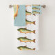 ¡Este sistema estupendo de la toalla de la diversión está para el entusiasta de la pesca! Las toallas y el paño del lavado se cubren en diversos diseños de los pescados de la trucha y modelos de la trucha. El washcloth y la toalla de mano tienen un fondo del verde azul, mientras que la toalla de baño es blanca con el modelo de la trucha. La toalla de mano tiene apenas un gráfico grande de una trucha en vez de un modelo como el paño de la toalla de baño y del lavado. ¡Este sistema es perfecto para las cabañas de madera, casas del lago y para cualquier persona esa pesca de los amores! ¡Cortina de ducha de la coordinación y estera de baño también disponible terminar el tema!