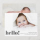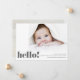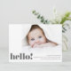 ¡Tu bebé está aquí y es hora de decírselo al mundo! El Modern Bold Hello Photo Birth Announement tiene un gran espacio de fotos en la parte delantera para presentar a su recién nacido a sus amigos y familia y mucho espacio para agregar su nombre, detalles de nacimiento y un mensaje. En la parte posterior, añada otra foto de su bebé para personalizar más su tarjeta.
