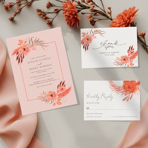 The warm palette pairs well with rustic, boho, garden, and fall wedding themes. It also matches beautifully with coral and terracotta wedding invitation sets.