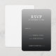 This wedding RSVP card features a sleek, modern design with a gradient background transitioning from light to dark gray. The layout is clean and balanced, emphasizing the bold, uppercase "RSVP" text at the top center, followed by smaller, aligned details for date and response options. Customizable fields allow guests to indicate their attendance status and number of attendees, making it both functional and stylish. The minimalist aesthetic, sans-serif typography, and professional tone make this card ideal for contemporary weddings, ensuring clarity and elegance in communication.