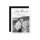This modern minimalist black and white wedding elopement announcement features one front photo with elegant Just Married calligraphy script. Personalize the location and ceremony date details to let friends and family know where the private wedding took place. The back of this newlywed we tied the knot marriage announcement is sophisticated black, and the front is classic black and white. The photo will not automatically print in black and white, so if you would like to change a color photo to black and white please select that option during customization.