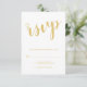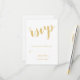 Tarjeta RSVP de la moderna Script Gold Wedding con título en letra de escritura moderna de oro con detalles en letra sans serif moderna de oro sobre fondo blanco. Nota: Los detalles del Relieve metalizado se simulan en la obra de arte. Este producto no contará con ningún relieve ni capa que creen un efecto metalizado.
