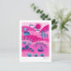 This notecard features a vibrant, stylized landscape with a whimsical and modern aesthetic. It uses a rich color palette of deep blues, vibrant pinks, and purples to create a layered, multi-dimensional scene with imaginative details, including flying fish, birds, a small sailboat, and a stylized house nestled in the hills under a pink sun. Contrast colors that give it a playful, yet sophisticated feel.