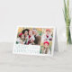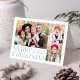 Tarjeta navideña simple y elegante con un collage de fotos en la parte delantera con "Feliz Navidad" en letras modernas de color azul escarpado. Personalice la parte delantera de la tarjeta agregando sus fotos y su nombre. En el interior de la tarjeta hay espacio para el mensaje personal escrito a mano o con tipeo. La parte posterior de la tarjeta de vacaciones plegada muestra la cuarta foto con un patrón blanco de copo de nieve. La tarjeta multifoto de vacaciones es perfecta para mostrar todas tus fotos familiares favoritas.