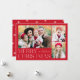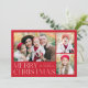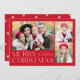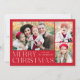 Tarjeta navideña simple y elegante con un collage de fotos en la parte delantera con "Feliz Navidad" colgado en letras blancas y modernas sobre un fondo rojo. Personalice la parte delantera de la tarjeta agregando sus fotos y su nombre. La tarjeta se invierte para mostrar la cuarta foto con un patrón de copo de nieve blanco. La tarjeta multifoto de vacaciones es perfecta para mostrar todas tus fotos familiares favoritas.