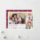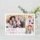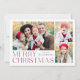 Carta de vacaciones sencilla y elegante con un collage de 3 fotos en la parte delantera con "Feliz Navidad" colgado en letras modernas de vino. Personalice la parte delantera de la tarjeta agregando sus fotos y su nombre. La tarjeta se invierte para mostrar la cuarta foto con un patrón de copo de nieve blanco. La tarjeta multifoto de vacaciones es perfecta para mostrar todas tus fotos familiares favoritas.