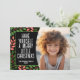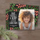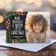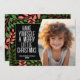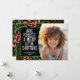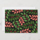 Un aspecto moderno para una tarjeta fotográfica de vacaciones. Delantero - Un arco simple bordea la foto con un fondo coral, verde y negro y un gran y simple tipografía de bienvenida navideño. Las hojas botánicas están incluidas en el fondo. Atrás - Un patrón botánico moderno con hojas y bayas.