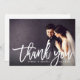 La plantilla de tarjeta de agradecimiento de boda plana y elegante cuenta con un diseño de superposición de "gracias" con letra manuscrita cepillada rústica y monograma moderno, y una foto de paisaje de la novia y el novio en el anverso. Incluye una segunda foto de retrato y un texto de agradecimiento personalizable en negro en el reverso de la tarjeta.