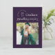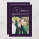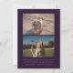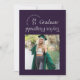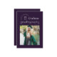 Esta moderna invitación de graduación muestra una fotografía cuadrada en un fondo morado oscuro y una tipografía de moda con el nombre de la escuela y el año de graduación dando la impresión de un sello y el nombre de los graduados resaltado de una manera muy moderna y a la moda, reflejando de cabeza la información de otra graduación. La parte trasera de la invitación de graduación incluye dos fotografías, perfectas para incluir una foto infantil, y un lugar para un mensaje más largo, ideal para resaltar los logros del graduado o los planes futuros.