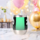 Celebra los dos grandes con estilo con este vaso de vino sin tallo de acero inoxidable, que tiene un llamativo bloque negro, blanco y verde menta y letras escritas a mano sobre un rico fondo negro a gris humeante. El reverso muestra un diseño idéntico. Diseño © W.H. Sim. Ver más en zazzle.com/expressionsoccasions