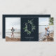 Elegante marco botánico acuático, tarjeta fotográfica de vacaciones. Funciones de diseño, moderno marco azul oscuro "JOY", dos fotos frontales verticales y líneas de texto de plantilla para tu mensaje corto, nombre y año. Coordenando el respaldo de patrones de rayas azul oscuro y blanco.