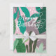 Carta de bienvenida plana "Happy Birthday" floral moderna y elegante. Cuenta con plantas tropicales, hojas y flores, letras de escritura blanca y espacio en la parte posterior para un mensaje especial. Para solicitudes especiales, no dude en enviar un mensaje a la tienda para diseños personalizados, por ejemplo, disposición, color o tema.