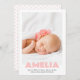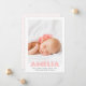 Presentamos la moderna tarjeta de anuncio de natalidad de foto de Chica rosado mínimo. Esta elegante tarjeta contiene una hermosa foto de tu pequeño, junto con su nombre en un encantador tono rosa. El diseño es elegante y moderno, con mucho espacio para mostrar la foto de su bebé. En la parte inferior de la tarjeta encontrará todas las estadísticas importantes, incluyendo el peso, la altura y la fecha de nacimiento de su bebé. El tipo de letra usado para las estadísticas es simple y fácil de leer, lo que hace que sea una brisa para los amigos y familiares tomar todos los detalles. Esta tarjeta es la manera perfecta de anunciar la llegada de su pequeña niña al mundo. Es moda, subestimada, y seguro que será un éxito con todos los que la reciben.