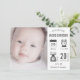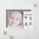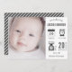 Tarjeta de anuncio de nacimiento moderna con elementos de infografía lindos y tipografía moderna sobre un fondo blanco. Añada todos sus preciosos detalles sobre esta plantilla fácil de usar y adorne esta tarjeta con la foto de su bebé para convertirla en una invitación única. Girar la tarjeta para mostrar un patrón de rayas grises y blancas en la parte posterior de la tarjeta.