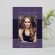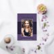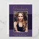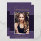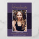 Una tarjeta de invitación exclusiva para graduación de fotos, que incluye elementos de diseño de un guión elegante de estilo manuscrito. La palabra "Graduado" y el nombre de los graduados en Relieve metalizado real (las opciones de color Relieve metalizado son oro, plata y rosa). La foto de los graduados está muy bordeada en un borde blanco y un adorno decorativo ondulado. El diseño se complementa con un fondo en tonos violeta y violeta. La parte posterior de la tarjeta ofrece un espacio de texto de invitación personalizado para ese graduado especial. Para ver más artículos como este, visita mi tienda aquí en "www.Zazzle.com/LakeViewCardCo". ¡Gracias