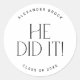 Esta moderna fete mínima que hizo fue pegatina de graduación es perfecta para un simple fiesta de grado para él. El diseño presenta una elegante tipografía boho con un toque sofisticado en blanco y negro minimalista. Personalice su pegatina de favores con el nombre del graduado y el año de clase.