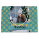 Navidades modernos y elegantes Tarjeta de vacaciones con un borde azul hielo y un guión de tipografía de color negro dorado sobre la parte delantera. La parte trasera de la tarjeta tiene un patrón de copo de nieve dibujado a mano con oro purpurina sobre un fondo azul turquesa de menta. Cambiar fácilmente la foto vertical de muestra con la suya propia.