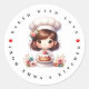 Moderno horneado con personalizado de panadería de amor pegatina. Un chef chica de panadería muy amable sostiene una deliciosa tarta de fresa esmerilada.