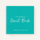 Un libro de visitas turquesa SOFT o HARDCOVER enlazado a una espiral permite a los clientes firmar sus mejores deseos, incluso añadir fotos instantáneas en las páginas. En la parte delantera aparece su nombre, fecha boda, las palabras "Nuestro libro de invitados Bodas" en letras de moda.